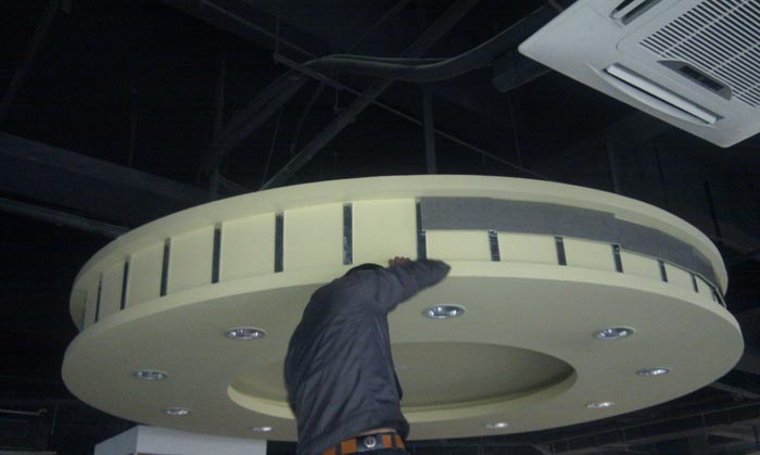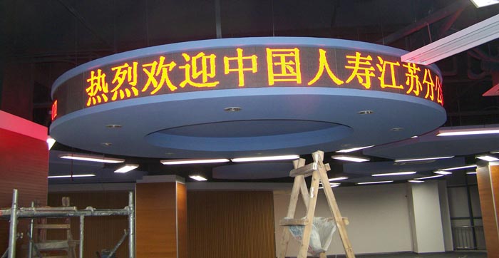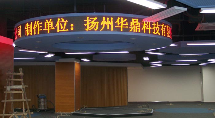 中心共设4层楼,为满足中心信息发布的需求,需在每层中心的圆弧造型吊顶面上安装LED显示,根据实际情况,我们为客户选择了P3.75双色单元板,拼接而成。